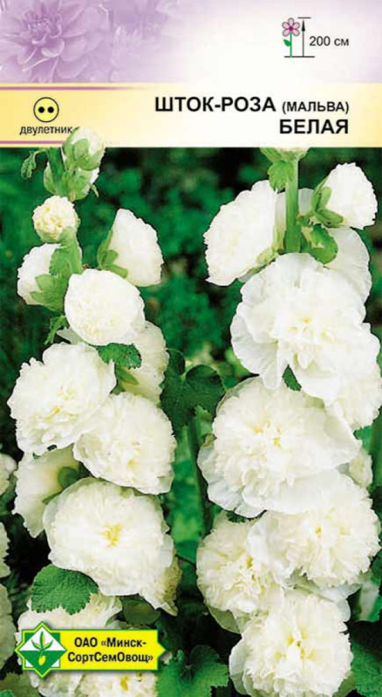 Двулетнее растение высотой до 2 м. Цветки белой окраски, махровые, в диаметре 10-12 см, собраны в изящные колосовидные соцветия. Для декорирования оград и зданий, прекрасно смотрится на заднем плане цветника. В букете сохраняется до 10 дней. Семена высевают в конце мая - начале июня. На постоянное место пересаживают с комом земли в конце августа. Хорошо зимует при легком укрытии. Засухоустойчива.